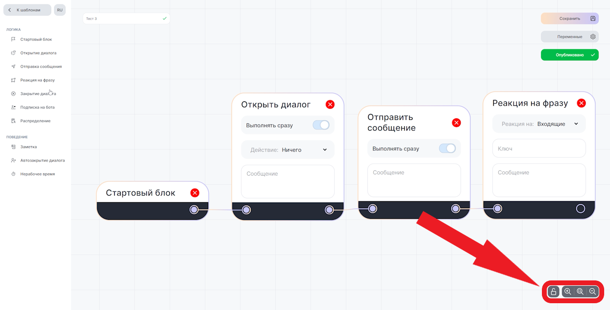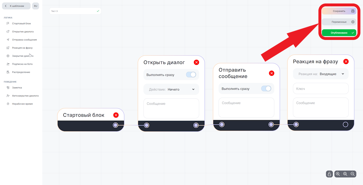 Чтобы бот использовал именно этот сценарий из всех сохраненных, нажмите «Опубликовать».