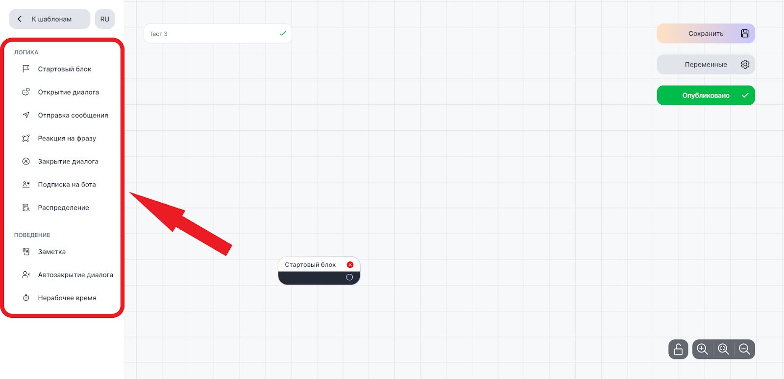 В боковом меню слева находятся блоки, из которых будет состоять сценарий — цепочка действий, выполняемых ботом.