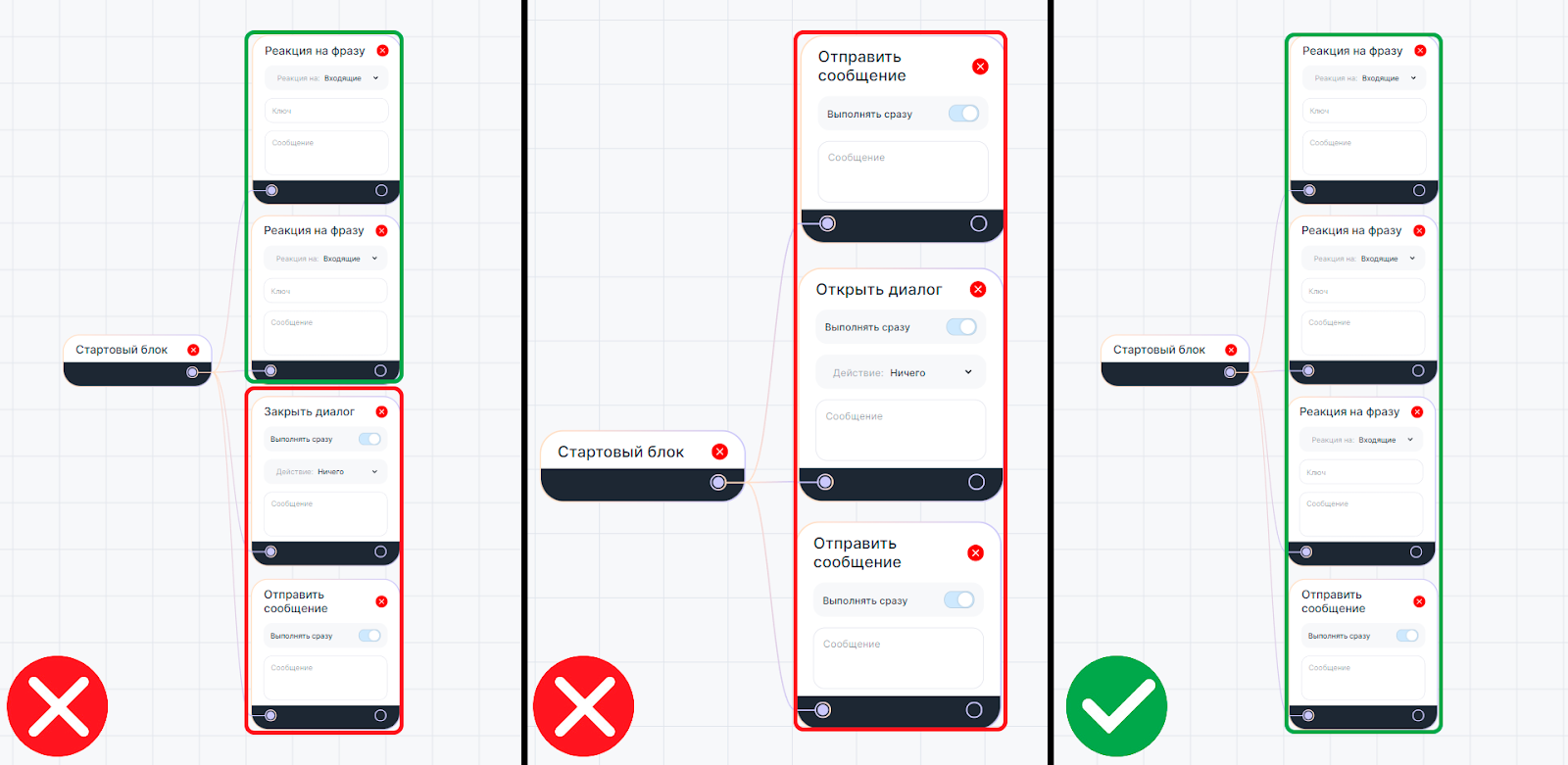 8. Из любого блока может выходить несколько блоков «Реакций на фразу». При этом вместе с «Реакцией на фразу» может выходить только один другой блок.