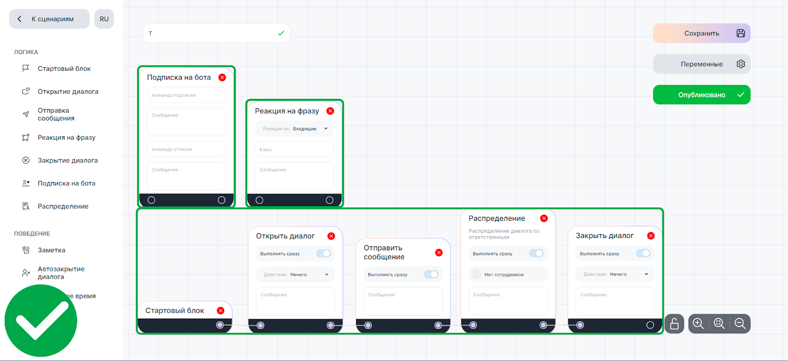 В этой статье представлены правила для сохранения сценария, если их не соблюдать, вы увидите уведомление об ошибке, и бот работать не будет.