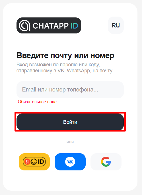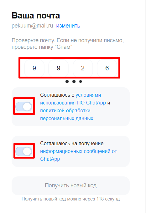 9. Подтвердите вход по коду из почты или СМС. Отметьте чекбоксы с согласием с условиями и политикой обработки данных ChatApp.