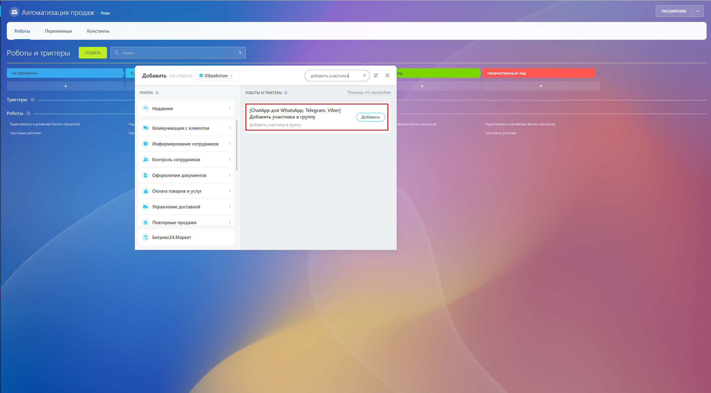 1. Добавьте робота ChatApp - Добавить участника в группу в сделку.
