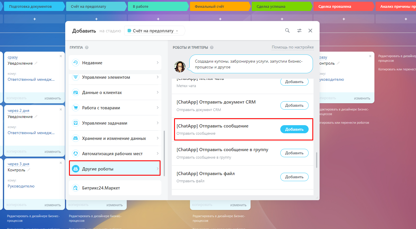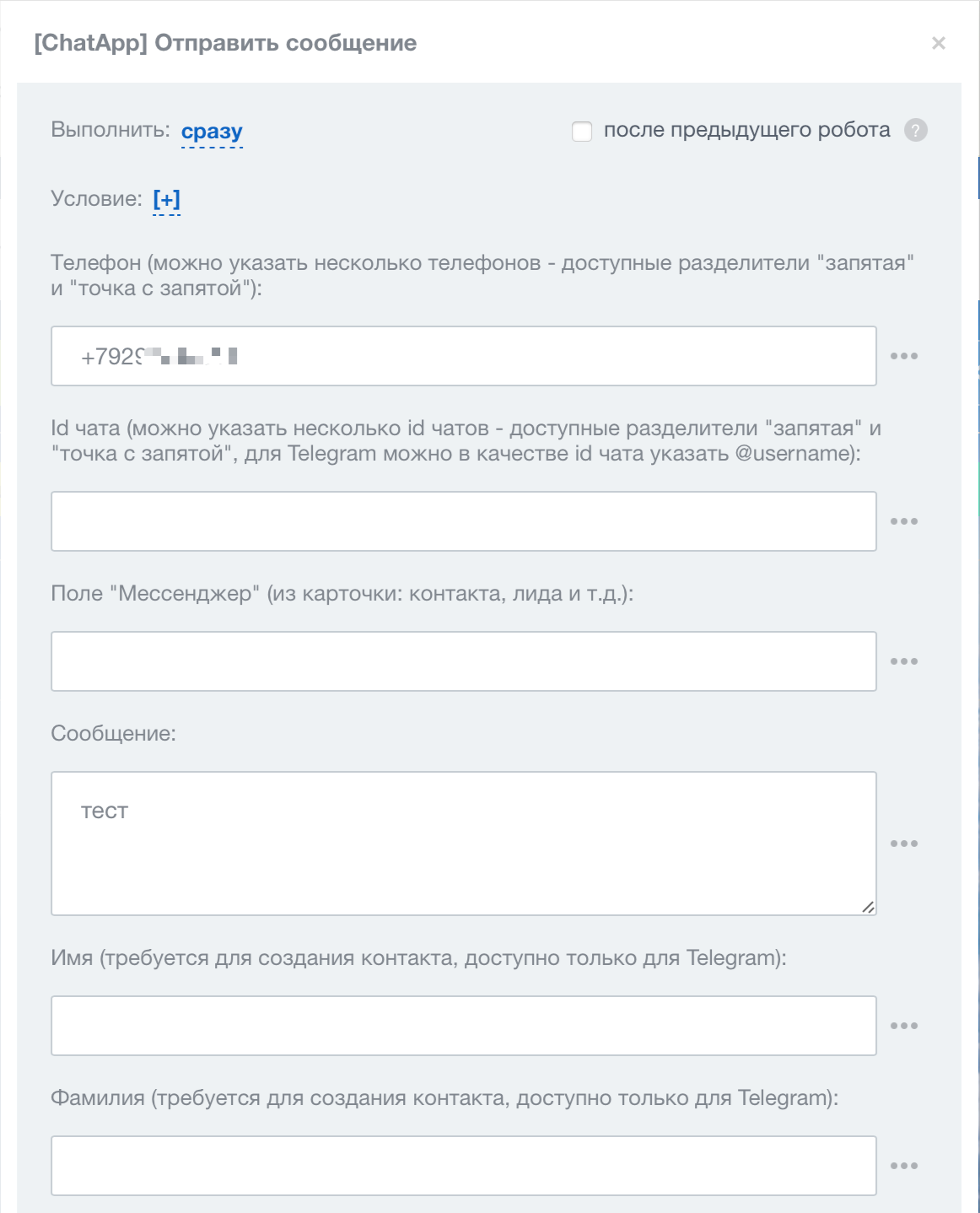 Робот «[ChatApp] - Отправить сообщение» позволяет отправить сообщение в мессенджер клиента на определенной стадии сделки.