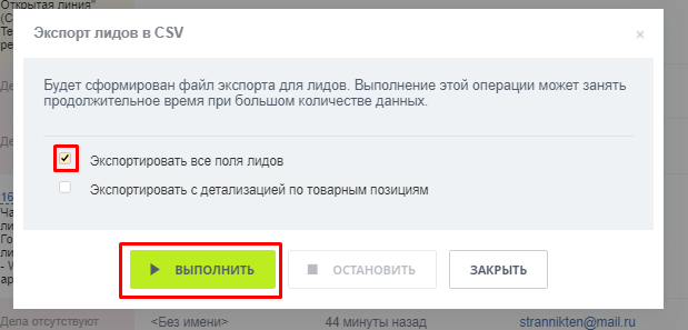• Во всплывающем окне установите галочку напротив пункта «Экспортировать все поля лидов» и нажмите на кнопку «Выполнить».