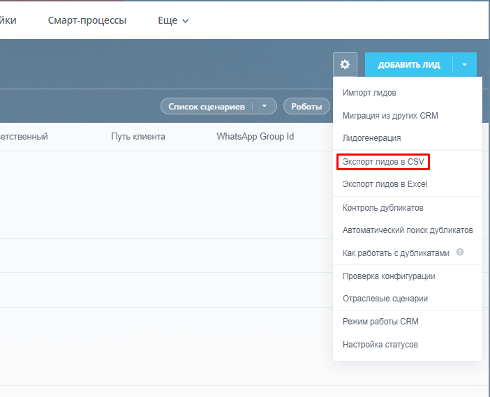 • В выпадающем списке выберите пункт «Экспорт лидов в CSV».