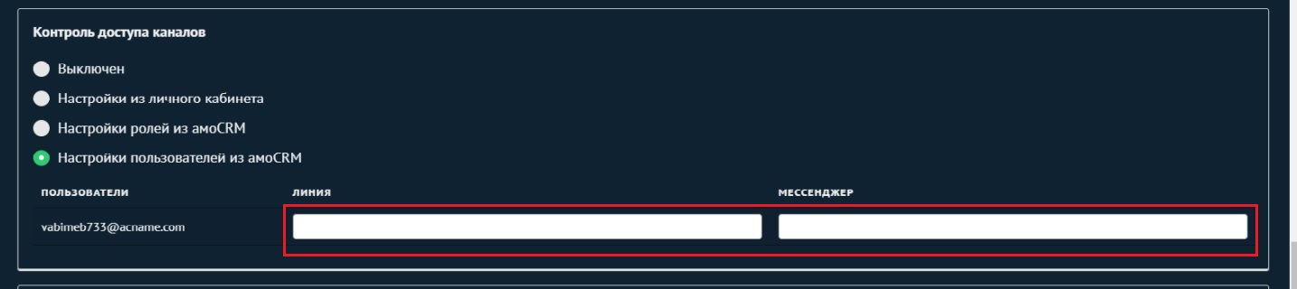 3. В блоке «Контроль доступа каналов» выберите пункт «Настройки пользователей из amoCRM». Добавьте линию и мессенджер для каждого пользователя.