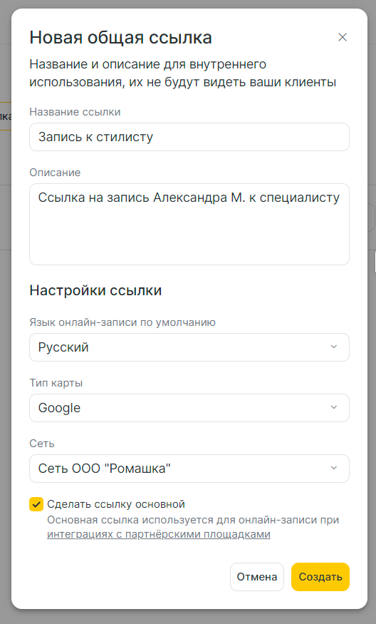 2. При создании новой ссылки на запись заполните параметры: