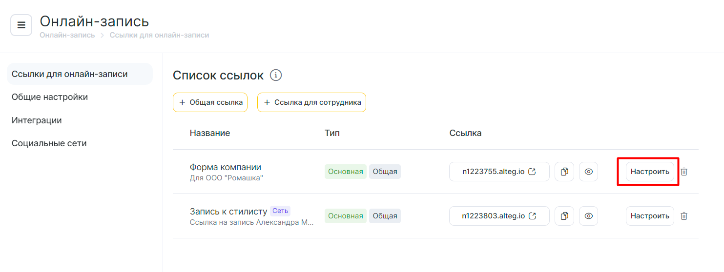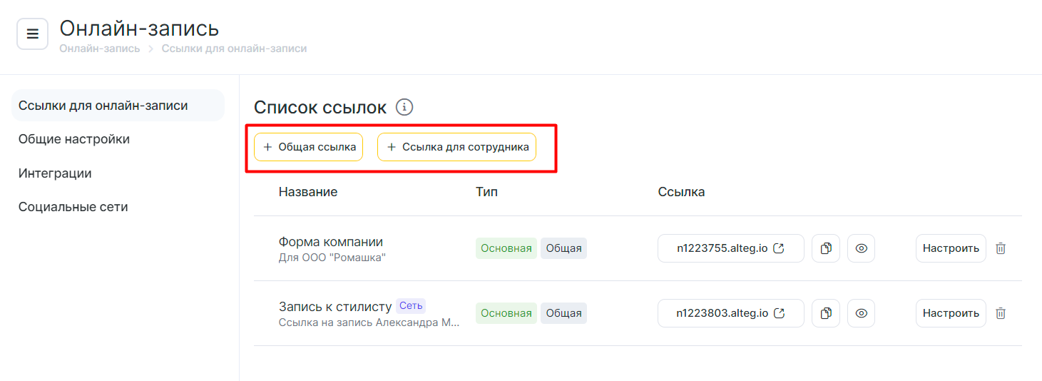 1. Зайдите в раздел «Онлайн запись». Выберите одну из существующих записей либо создайте новую ссылку:
