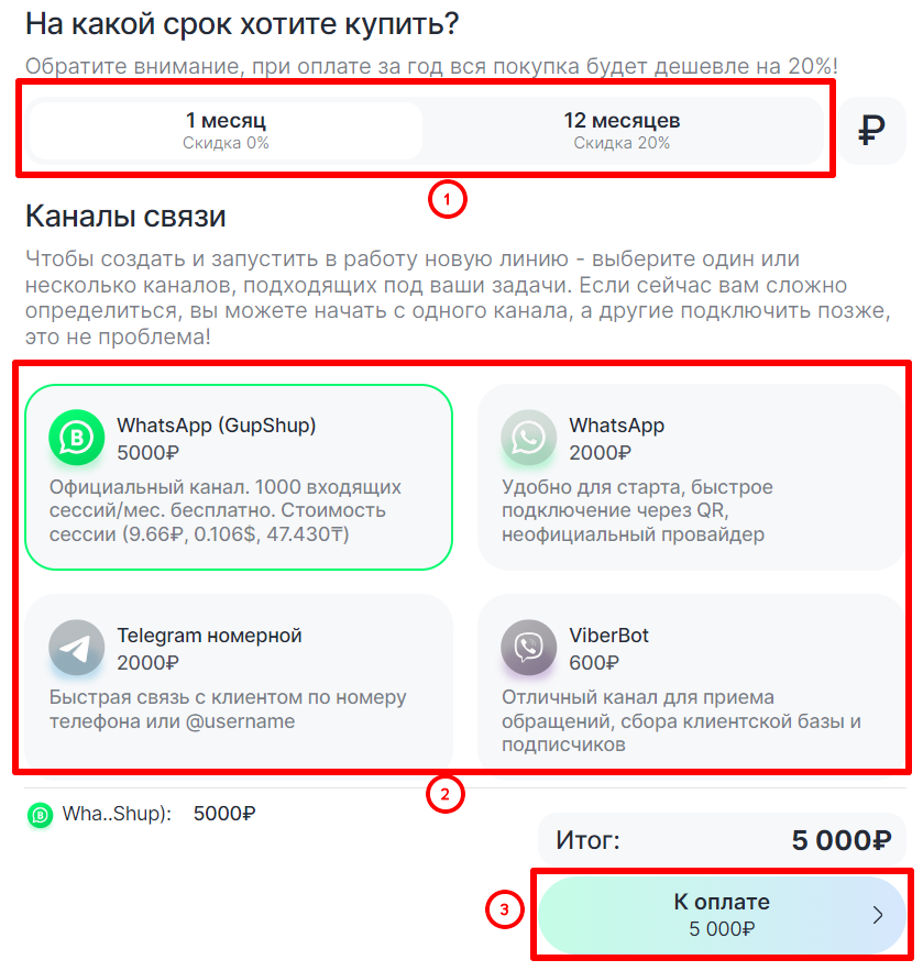 4. Выберите подключаемые каналы связи и период доступа линии. При покупке на 12 месяцев действует скидка 20%.