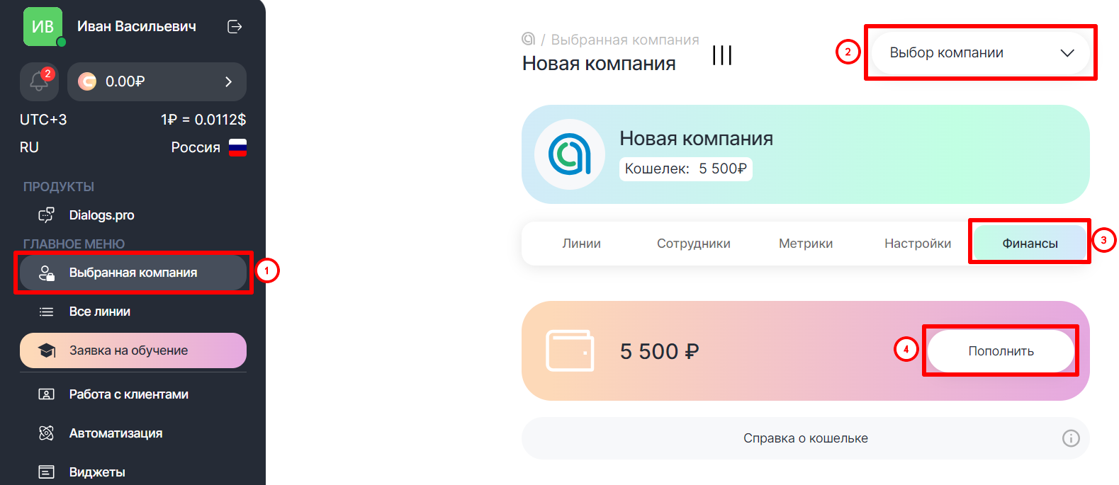 В разделе «Выбранная компания» можно создать неограниченное количество компаний. У каждой компании будет свой кошелек для оплаты и продления линий. От региона компании зависит валюта в Личном кабинете.