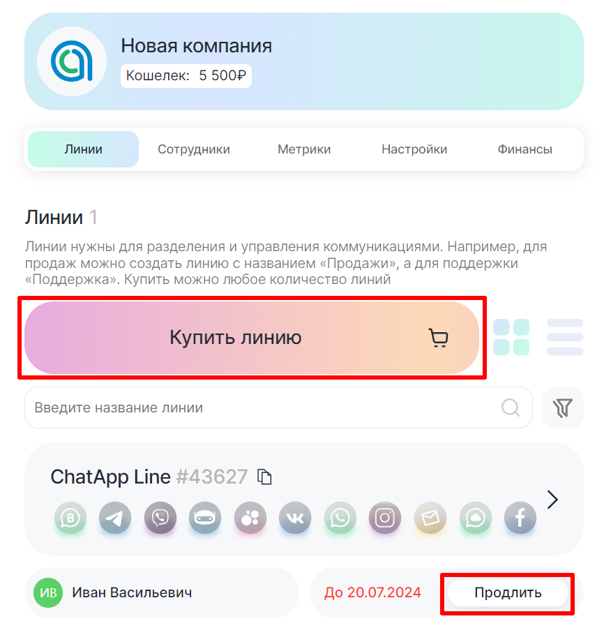 3. Во вкладке «Линии» нажмите «Купить линию» или «Продлить» рядом с уже имеющейся линией.