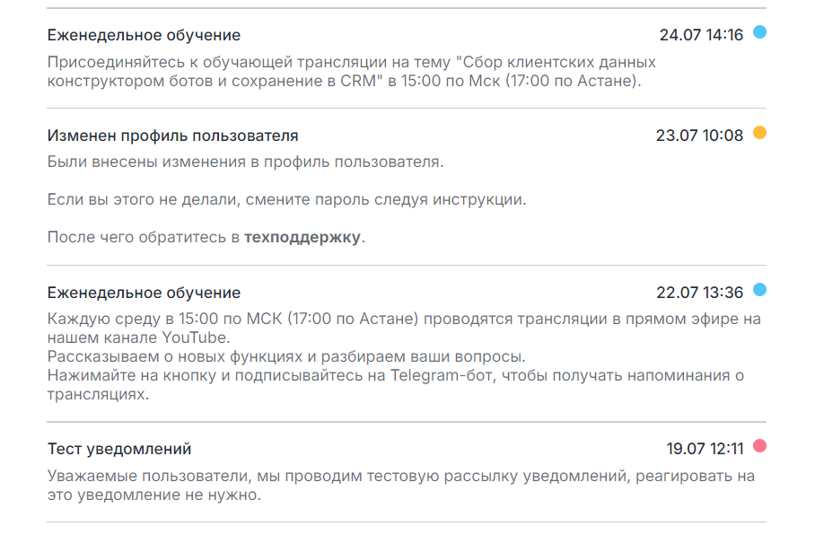 • Системные уведомления — о статусах каналов и линий, авторизации, смене пароля, изменениях профиля. Выделяются жёлтым цветом .