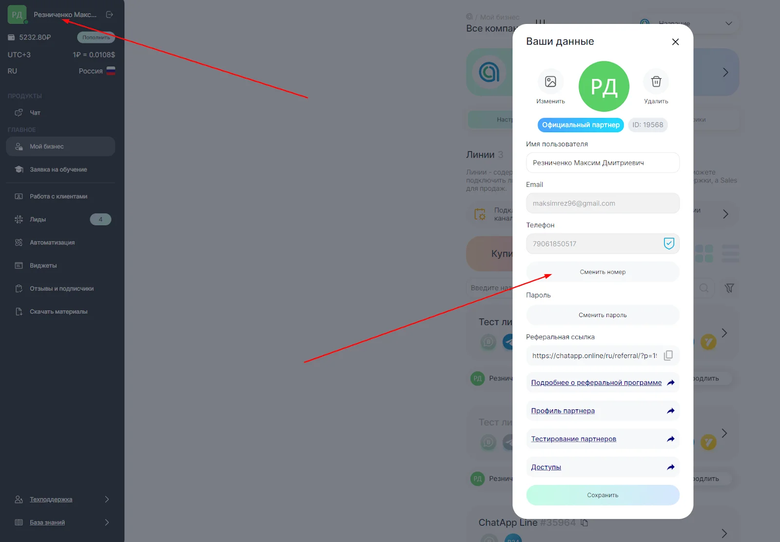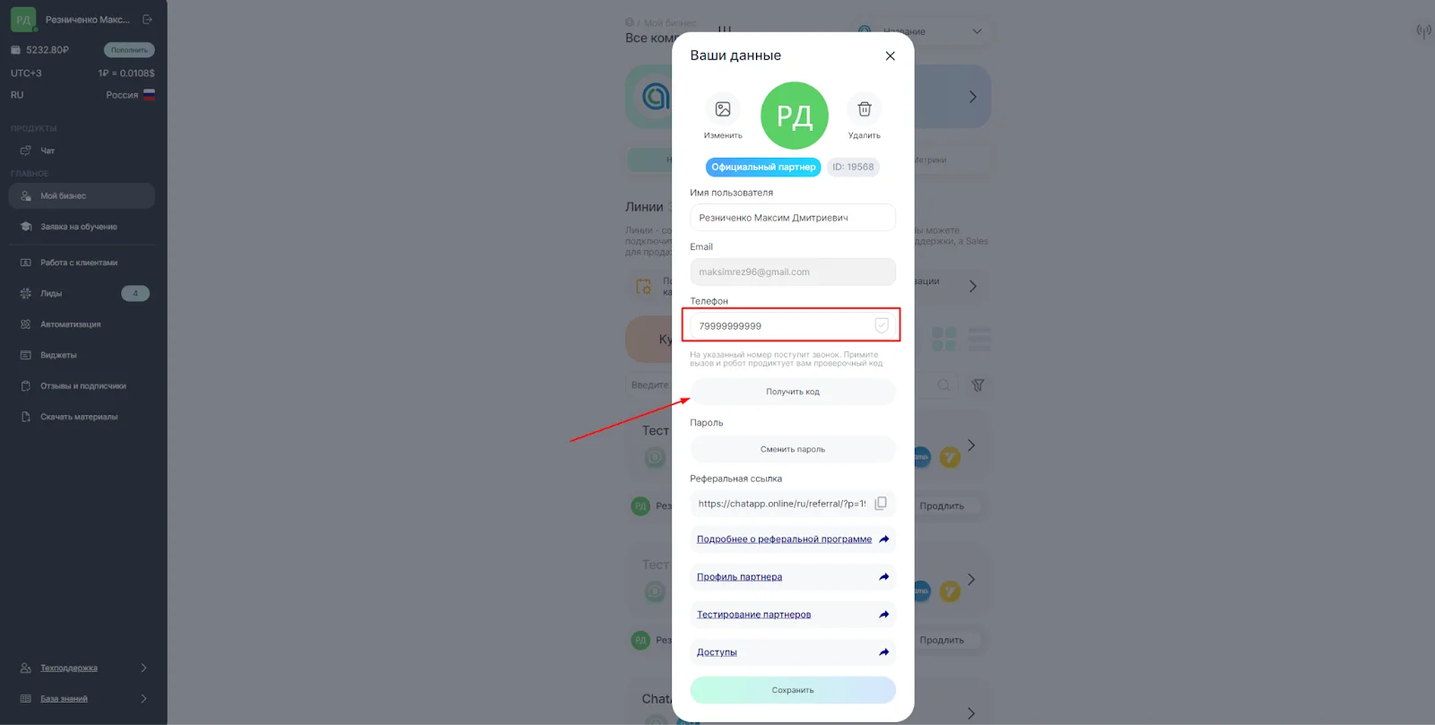 1. Зайдите в личный кабинет ChatApp;