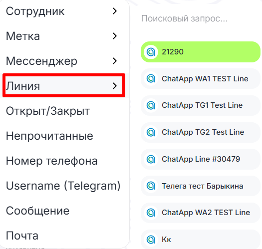 Посмотреть список подключенных линий и людей, ответственных за их ведение можно в ChatApp Dialog. Для этого: