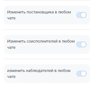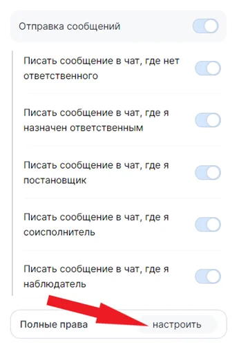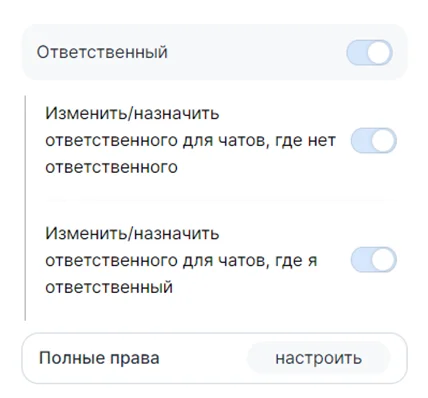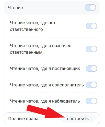 В этой вкладке возможно выдать полный или частичный доступ к чатам. Разрешить отправлять сообщения, а так же способность сотрудника назначать ответственных. Чтобы увидеть расширенные настройки нажмите «Настроить».