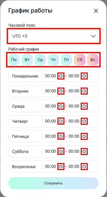 5. Выберите часовой пояс и настройте график работы. График можно ввести как вручную, так и через кнопку