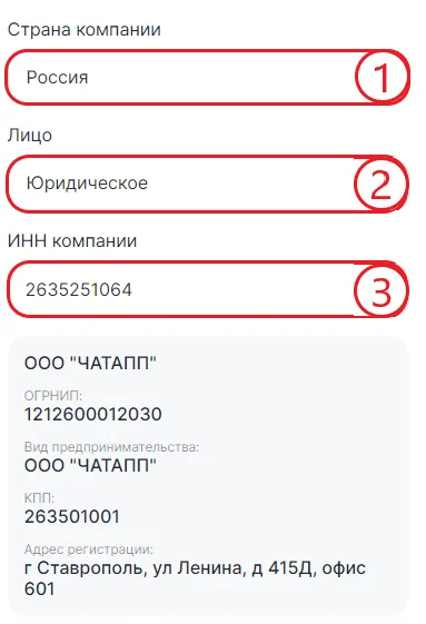 4. Для юридического лица добавьте ИНН. Если компания из России и номер указан верно, то автоматически отобразится адрес, тип и название компании. Для физического лица введите название и адрес компании.