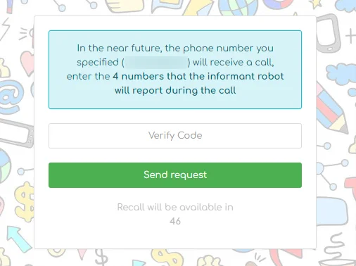 - Your phone number will receive a verification call - enter 4 digits that the robot informer will report during the call: