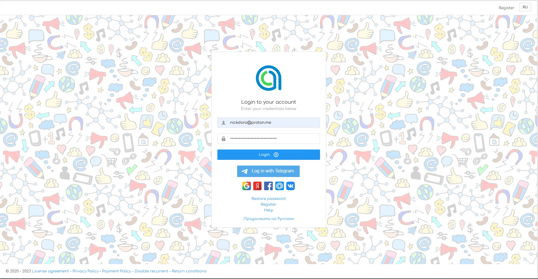 If you registered using one of the offered services (Google, Yandex, Facebook, Mail or VK), then you can log in by clicking on the icon of the service that was used for registration.