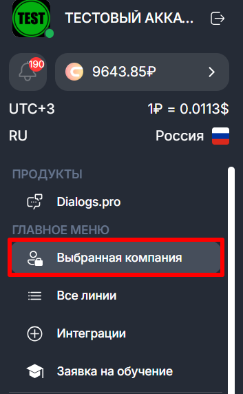1. Перейдите в раздел «Выбранная компания» в левом боковом меню.