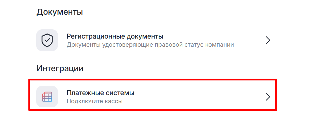 3. В разделе «Интеграции» выберите пункт «Платежные системы».