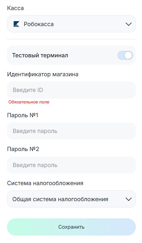 • Идентификатор магазина или ID терминала — введите ID магазина для Робокассы или терминала для Т-банка;