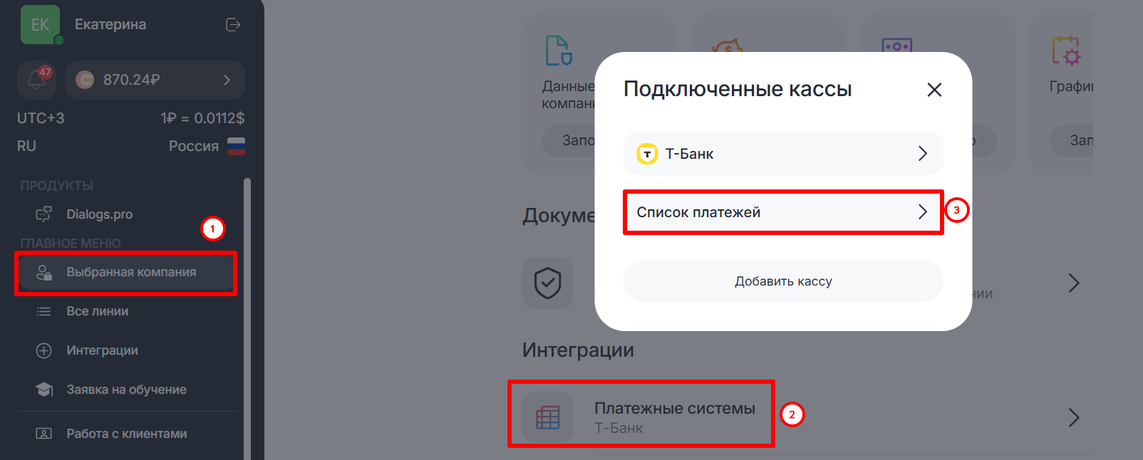 В личном кабинете можно подключить платежные системы — Робокасса и Т-Банк. Это позволит принимать платежи клиентов с помощью блока «Прием платежей» и затем получать сведения о платежах с помощью блока «Информация о платеже».