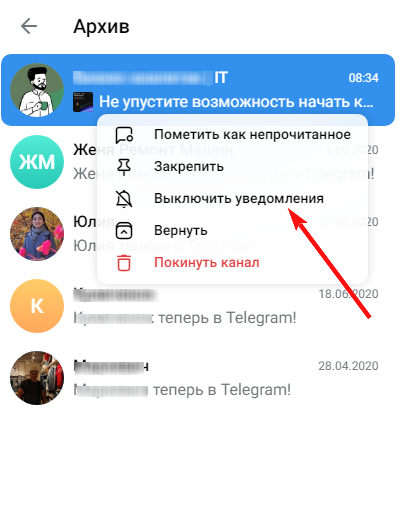 Если добавить чат в архив, то при поступлении туда новых сообщений чат вернется в общий список. Чтобы этого не произошло, в настройках телеграм-диалога отключите уведомления: