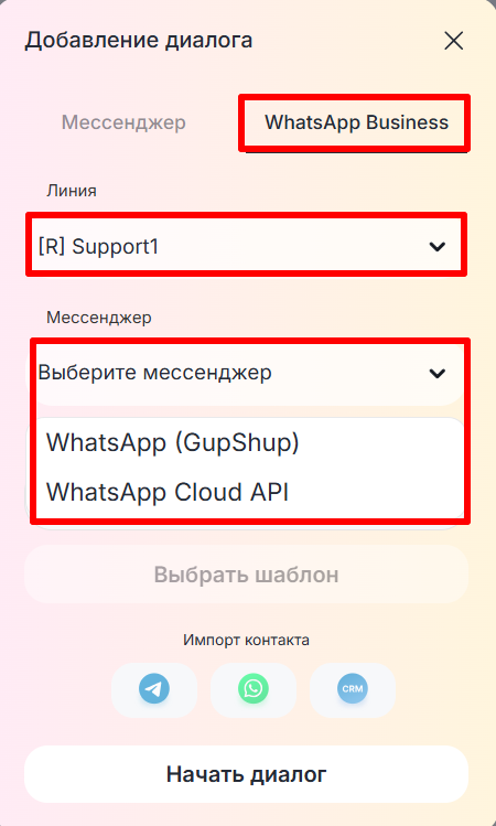 2. Выберите «WhatsApp Business», Линию и Мессенджер — WhatsApp (GupShup) или WhatsApp Cloud API. Введите номер телефона адресата.