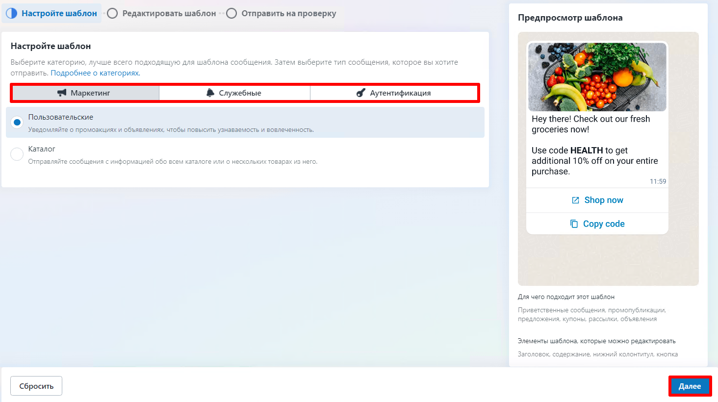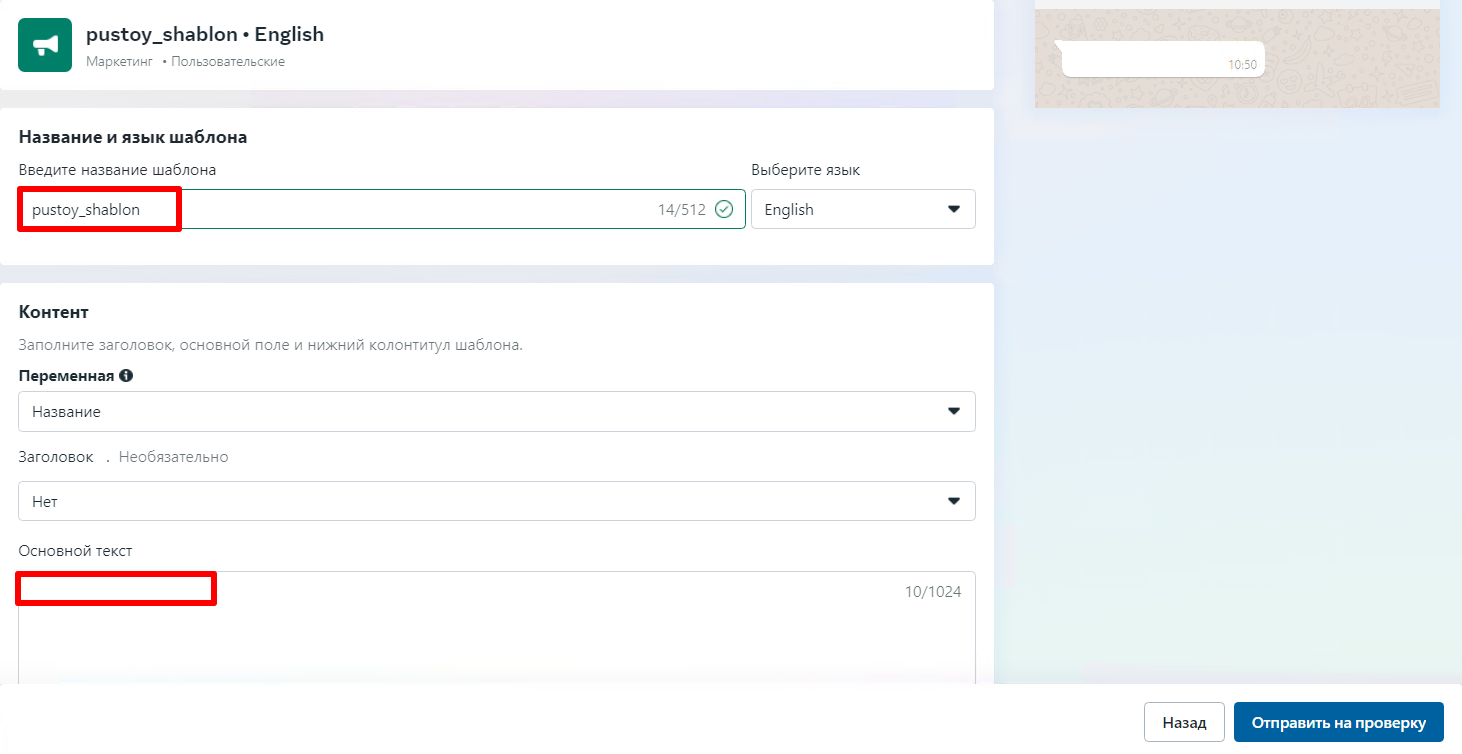 Создание пустого шаблона в WhatsApp Cloud API