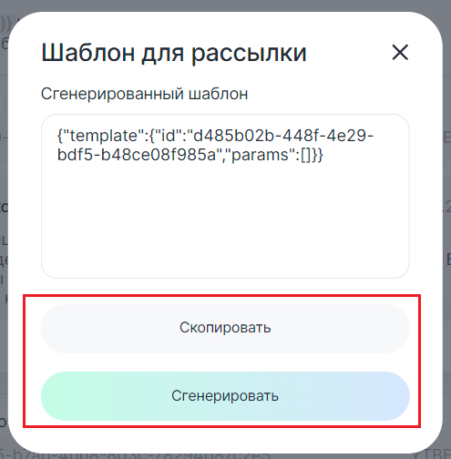 3. В новом окне «Шаблон для рассылки» нажмите «Сгенерировать», а затем «Скопировать» код.