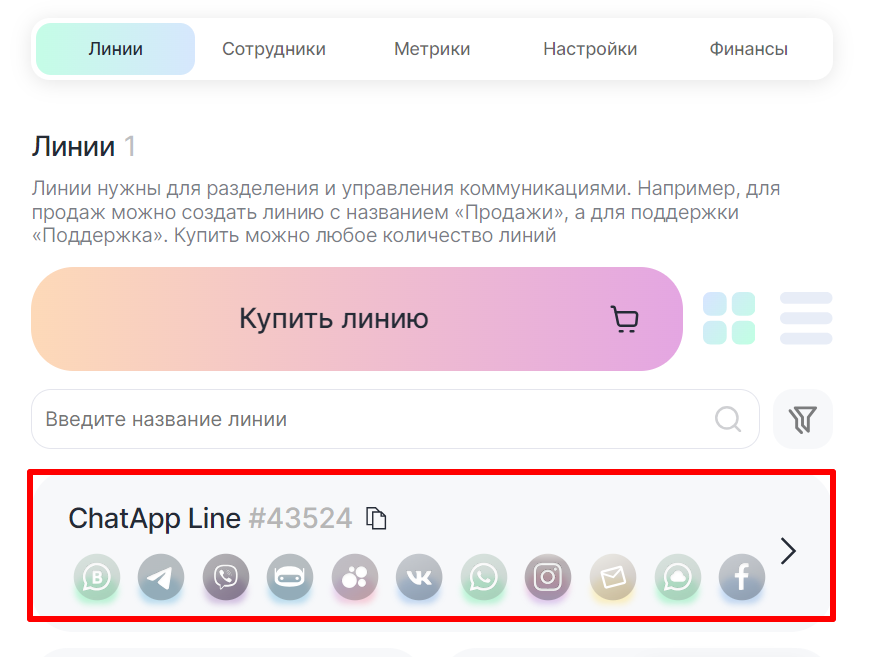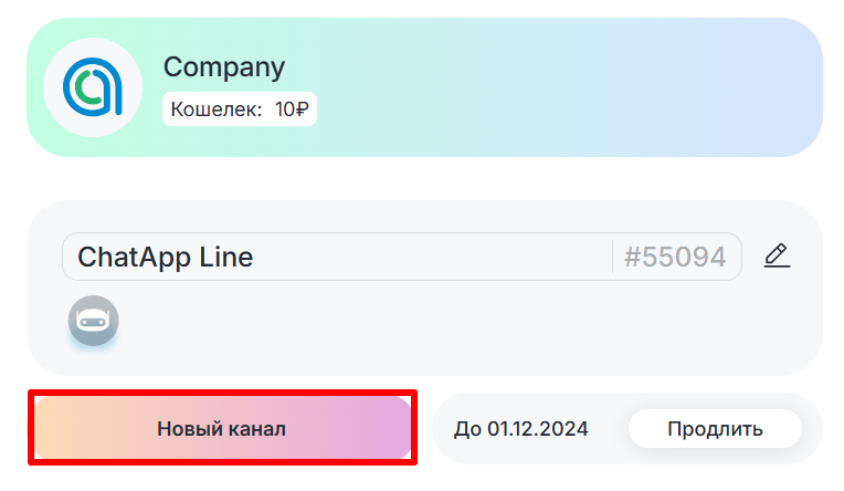 Чтобы докупить канал WhatsApp на уже созданную линию, нажмите «Новый канал» в настройках линии и выберите «[WEB] WhatsApp».