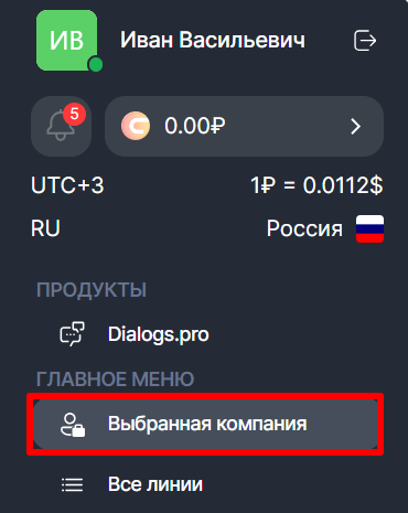 - Перейдите во вкладку «Выбранная компания» в Личном кабинете и нажмите на линию с WhatsApp.