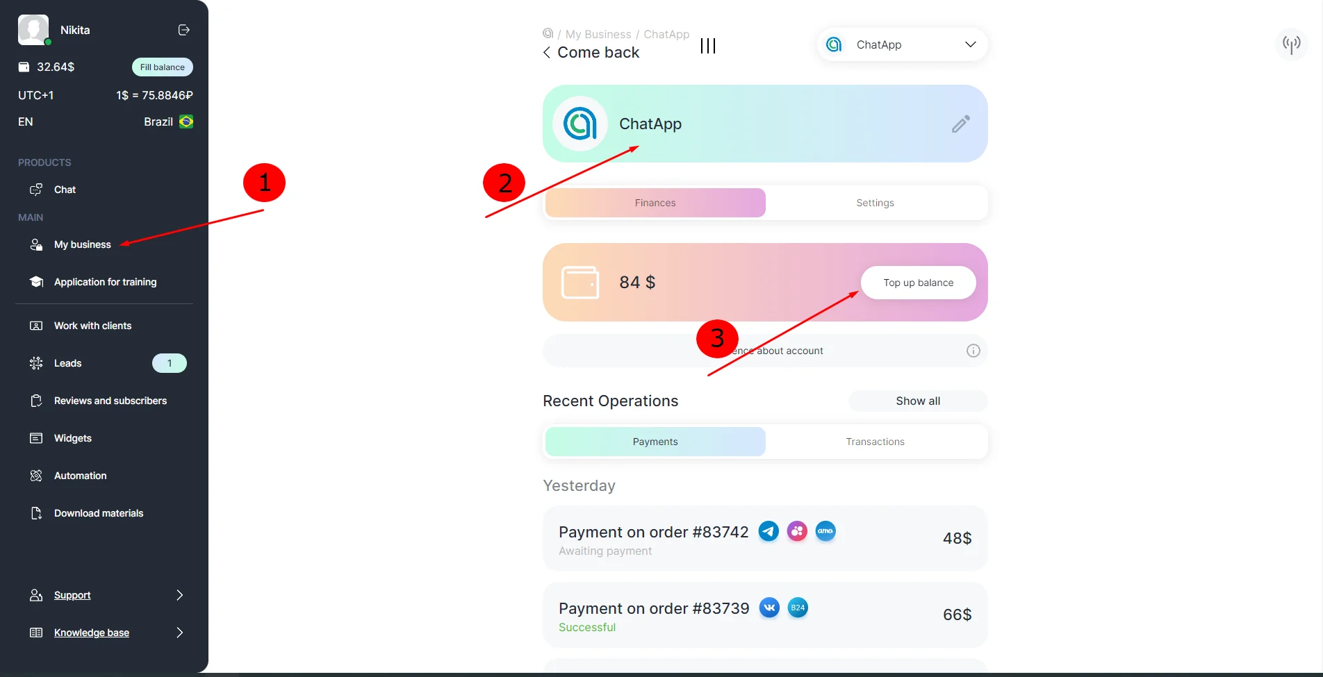 4. Select Finances and click Top up balance;