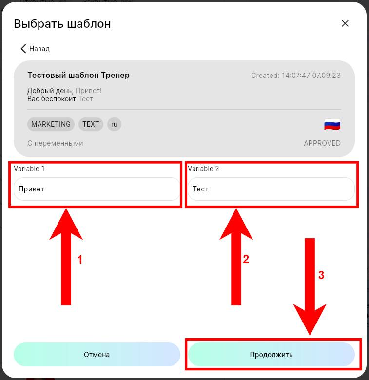 6. Выберите нужный шаблон. Если присутствуют переменные, заполните их. Нажмите «‎Продолжить».