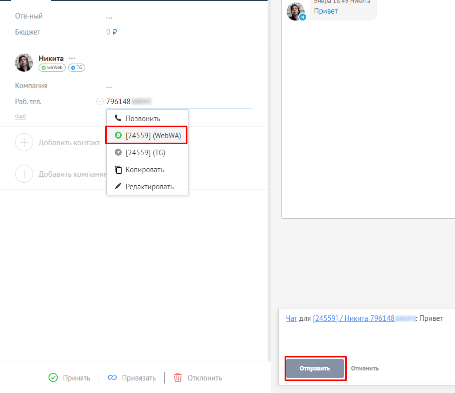 2. Нажмите на номер телефона и выберите (WA-API).