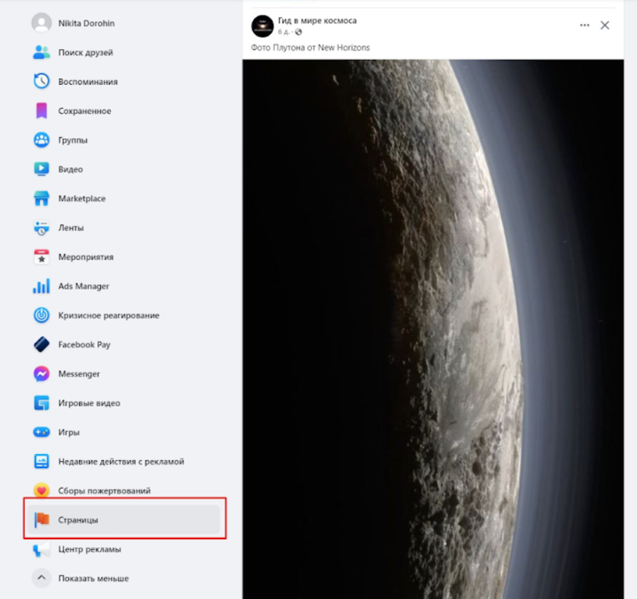 1. Зайдите в раздел «Страницы» в левой части вашего профиля на Facebook*.