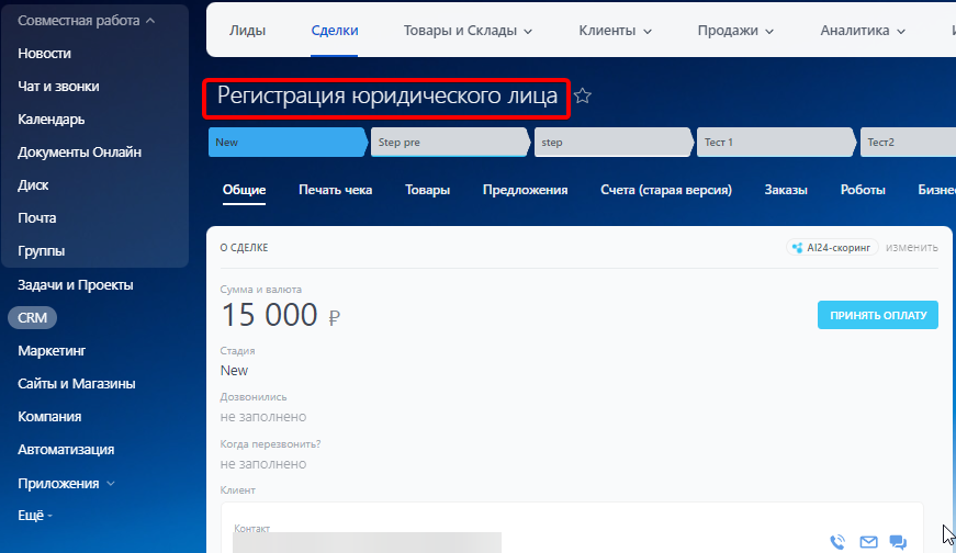В примере на скриншоте ссылка в разделе «Сделки» привела к сделке «Регистрация юридического лица» в Битрикс24.