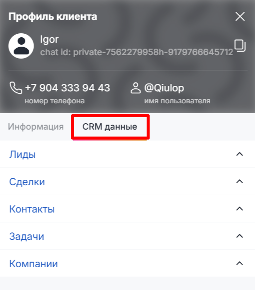 3. Откройте вкладку «CRM данные». В этом разделе отобразится информация о связанных с контактом данных из CRM: