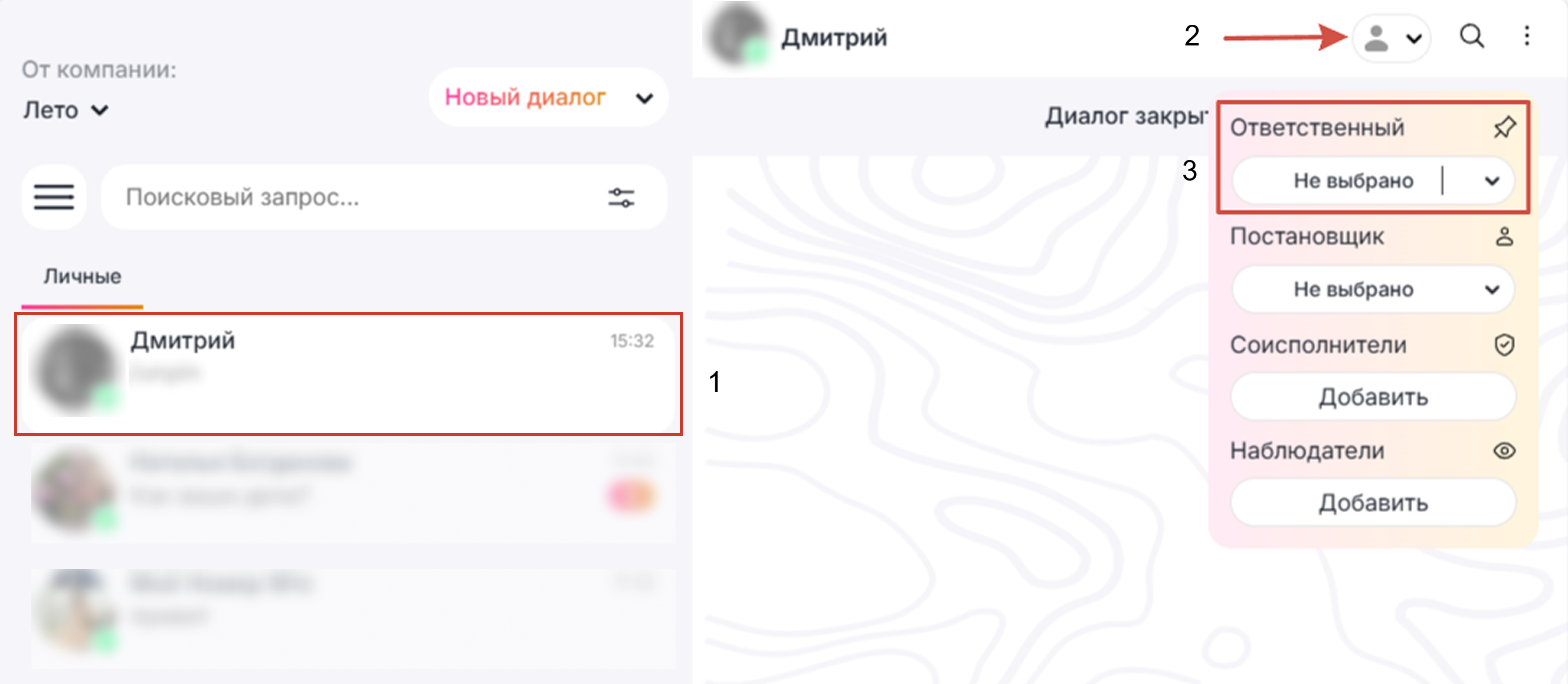 - Ответственный за диалог открепляется при ручной передаче диалога другому сотруднику;